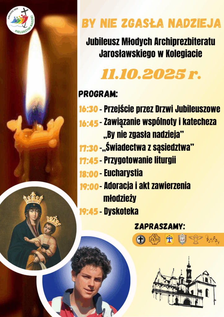 8. Także w sobotę serdecznie zapraszają młodzież z parafialnych wspólnot oraz młodzież przygotowującą się do sakramentu bierzmowania (kl. VI, VII, VIII) na Jubileusz Młodych pod hasłem: „By nie zgasła nadzieja”, który odbędzie się w Jarosławskiej Kolegiacie. Więcej informacji na plakacie i w Internecie.